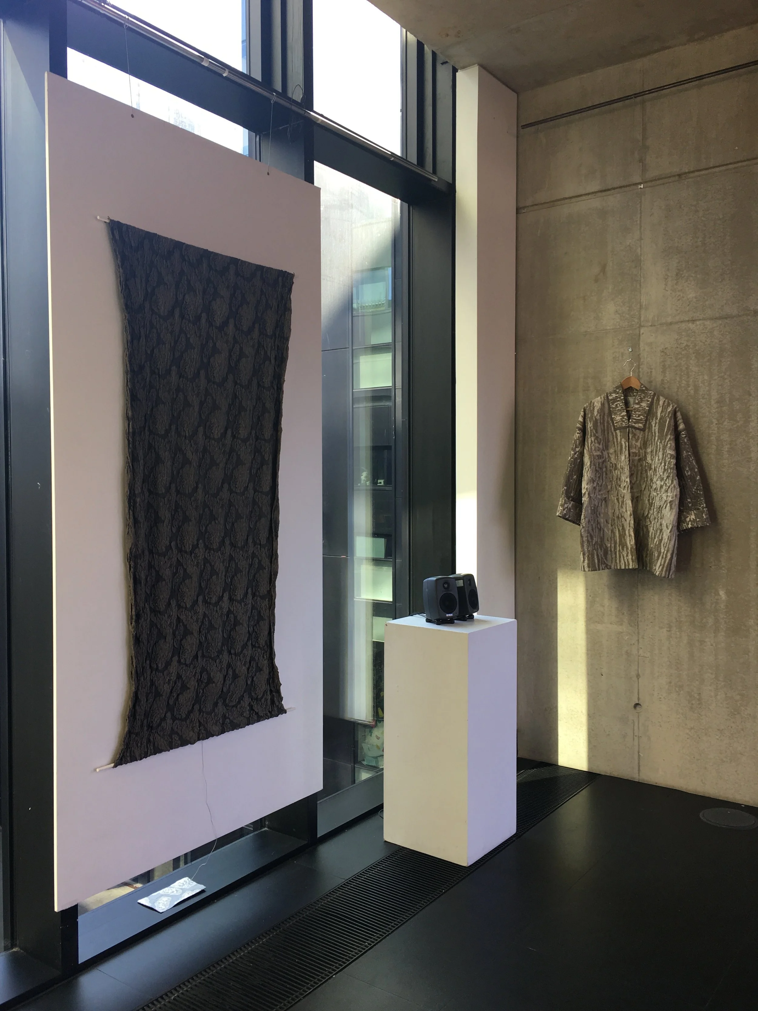Victoria exhibited at the IFFTI 2019 conference in Manchester. The exhibit involved a length of interactive fabric connected to speakers as well as one of the garments created in her doctoral research, which was not yet connected to the electronics.
